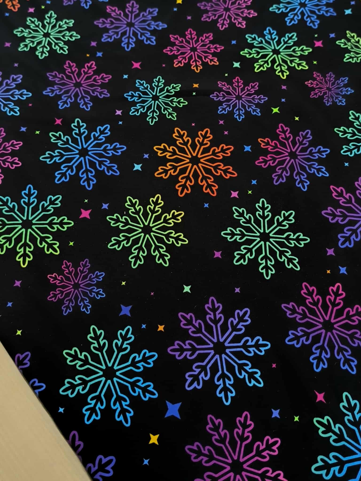 Dive into creativity with our Christmas Rainbow Snowflake Cotton Lycra Jersey Fabric! Perfect for sewing into cozy and playful clothes. Ideal for leggings, PJs, and more. Shop now for a burst of colour in every stitch!